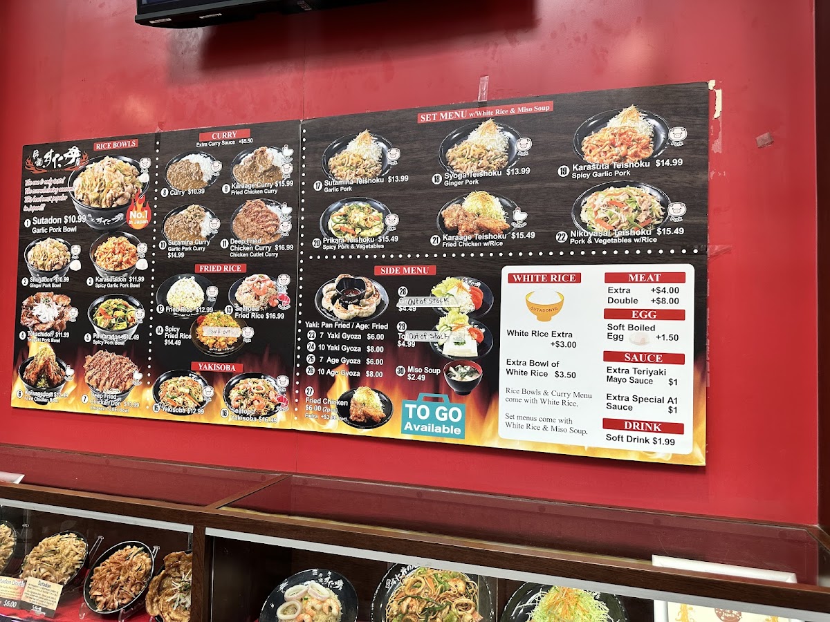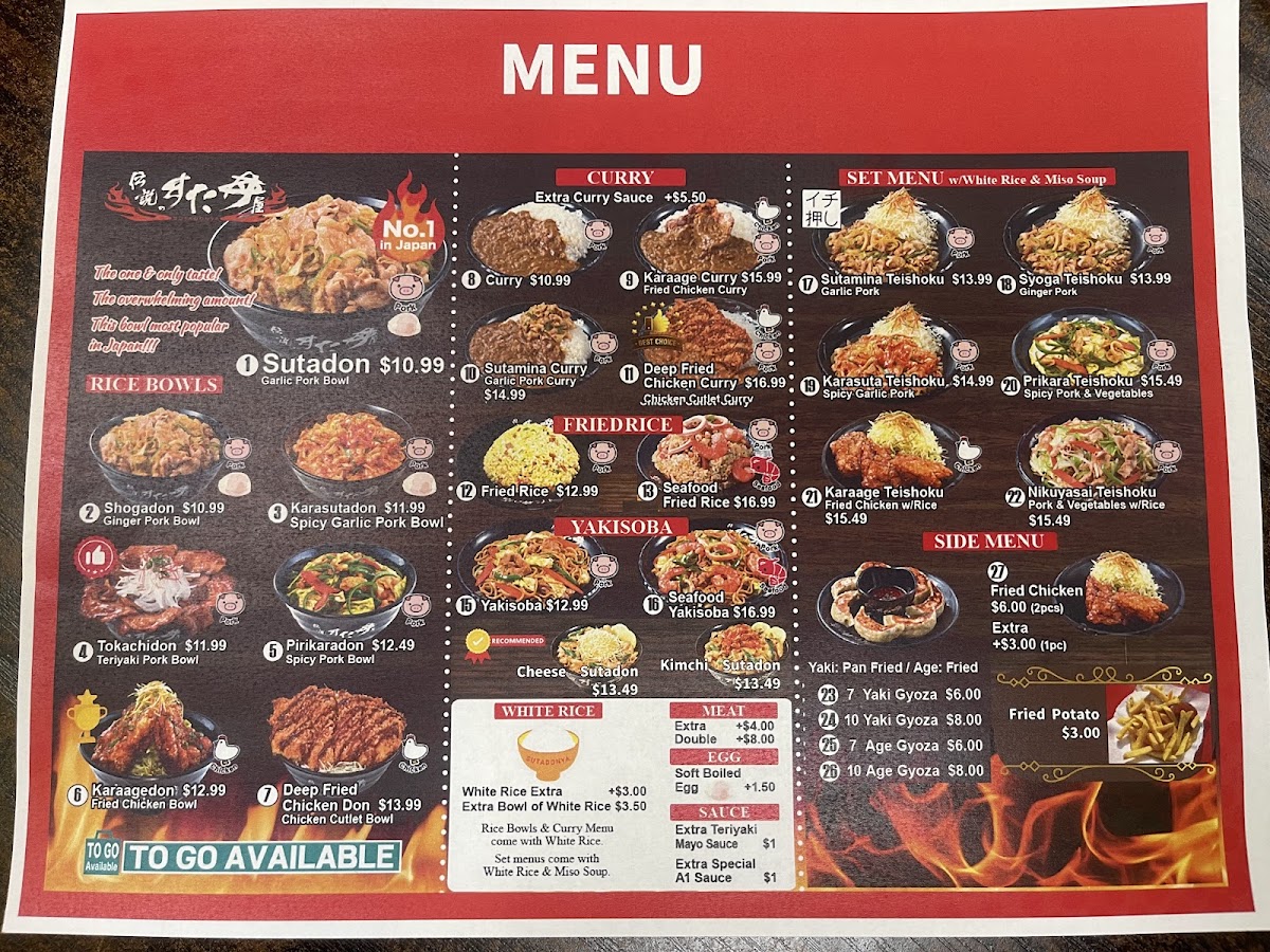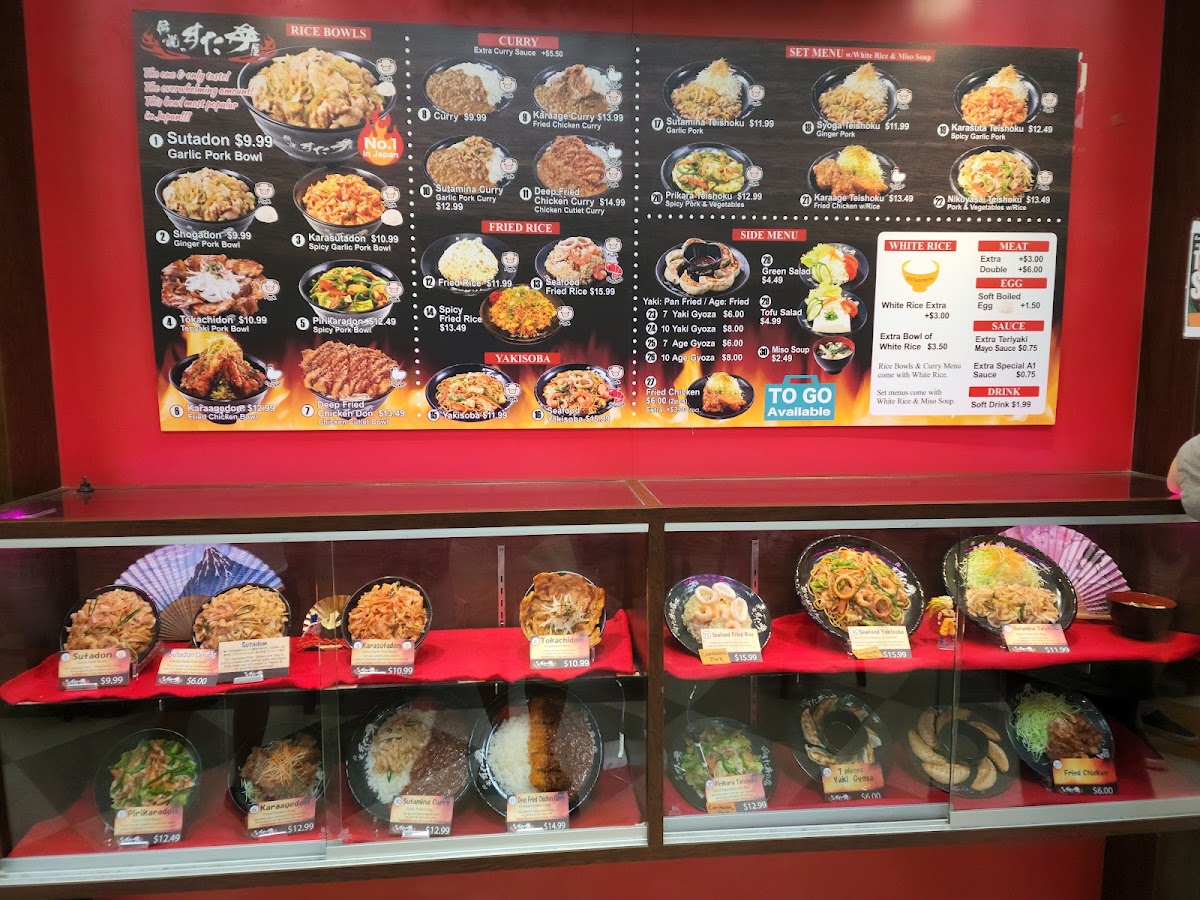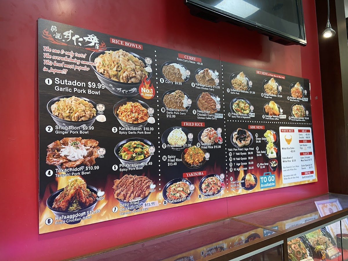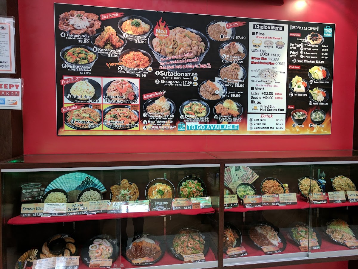From a reviewer’s perspective, the menu at Sutadonya Chicago, located at 100 E Algonquin Rd #153 in Arlington Heights, delivers a focused yet satisfying snapshot of Japanese comfort food, centered around hearty donburi bowls and well-balanced combo plates. The donburi selection is clearly the star, highlighted by signature pork bowls such as Sutadon / Garlic Pork Bowl, Karasutadon / Spicy Garlic Pork Bowl, and Tokachidon / Teriyaki Pork Bowl, each offering a different flavor profile that ranges from savory garlic-forward richness to a spicier kick and sweet-salty teriyaki notes. For those who prefer poultry, the Karaagedon / Fried Chicken Bowl stands out as a crowd-pleasing option, pairing crispy fried chicken with rice in a straightforward but comforting style. Beyond individual bowls, the restaurant’s Donburi Combo, Curry & Rice Combo, and Fried Rice Combo Plate provide a more complete dining experience, ideal for guests who want variety and value in a single order. These combos help round out the menu by catering to different appetites while maintaining the same Japanese-inspired identity. To complement the main dishes, the side menu keeps things classic with 10 Yaki Gyoza / Authentic Japanese Gyoza 10pcs and 7 Yaki Gyoza / Authentic Japanese Gyoza 7pcs, offering flexibility for sharing or solo snacking. Overall, the menu at Sutadonya Chicago feels cohesive and purposeful-rather than overwhelming diners with endless choices, it refines a core set of dishes and executes them with consistency. As a concluding impression, this menu successfully reflects the restaurant’s commitment to bold flavors, comforting portions, and a clear focus on donburi-centered Japanese cuisine, making it a reliable stop for anyone craving a satisfying and approachable Japanese meal.